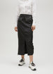 Black satin skirt with studs, front slit and adjustable drawstrings at the sides.